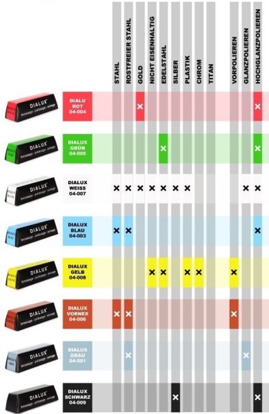Bekijk het overzicht van de Luxor® polijstpasta : tabel-luxorBekijk het overzicht van de Dialux® polijstpasta : dialux-tabel